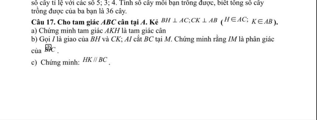 Câu 17. Cho tam giác ABC cân tại A. Kẻ BH – AC;CK LAB (HEAC; KEAB).
