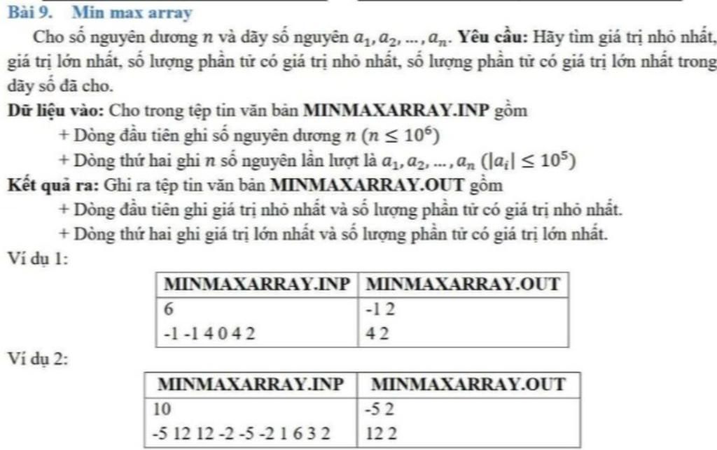 Khi đã có giá trị min, max ta duyệt lại mảng 1 lần nữa để đếm tần suất xuất hiện của 2 giá trị này bằng biến đếm cnt_mx và cnt_mn tương ứng tần suất xuất hiện của giá trị mx (max) và giá trị mn (min).
