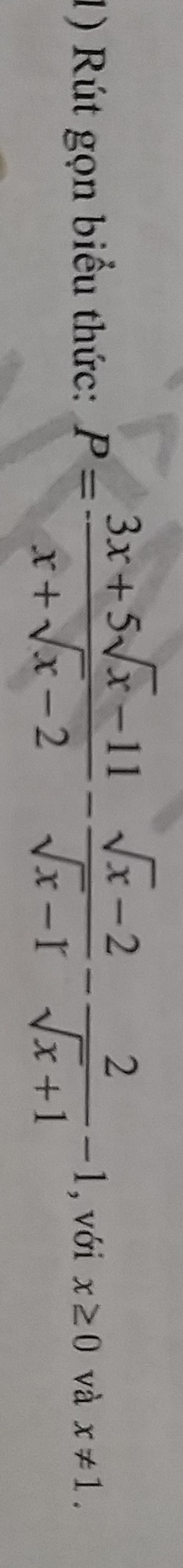 `P = (3x + 5sqrt(x) - 11)/(x + sqrt(x) - 2) - (sqrt(x)- 2)/(sqrt(x) - 1) - 2/(sqrt(x) + 1) - 1`
