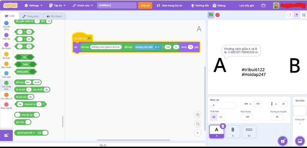 Để tính khoảng cách giữa `A` và `B` trong phần mềm lập trình Scratch, bạn có thể sử dụng lệnh sau trong mục Cảm biến: