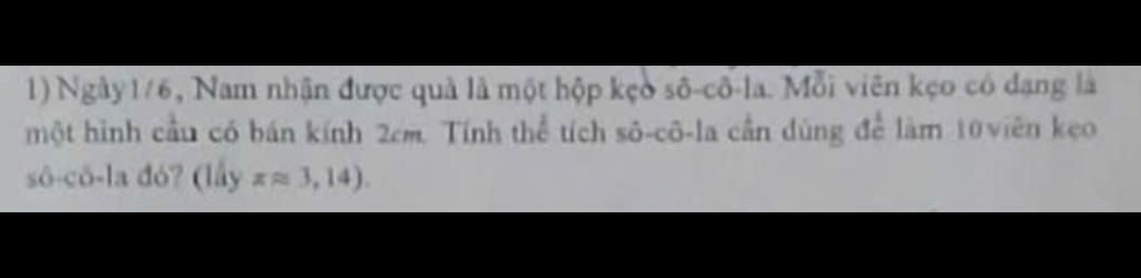 Vậy thể tích sô-cô-la cần dùng để làm `10` viên kẹo là `334,9(cm^3)`
