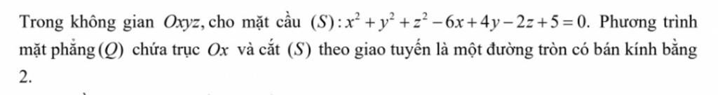 Xét: `d(I,(Q))=(|-2+k|)/(sqrt(0^2+1^2+k^2))=sqrt5`