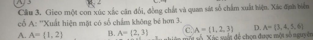 cố A: "Xuất hiện mặt có số chấm không bé hơn 3.