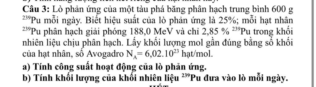 Câu 3: Lò phản ứng của một tàu phá băng phân hạch trung bình 600 g