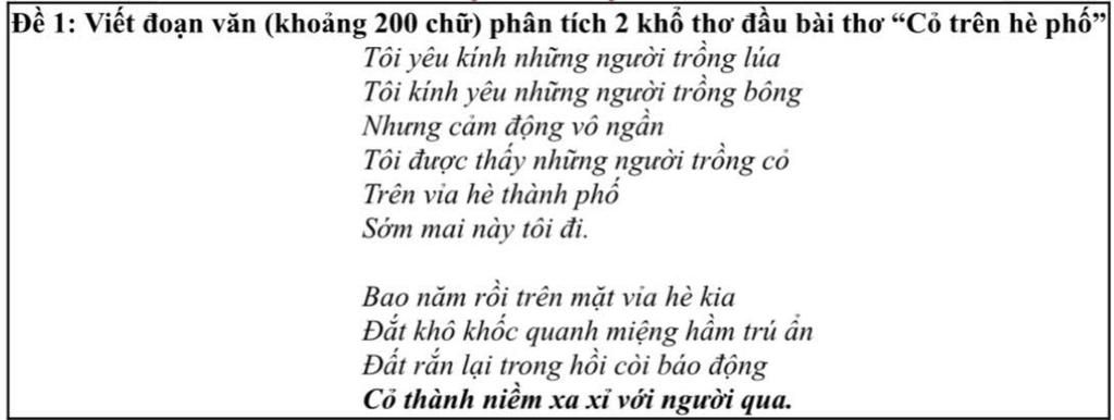 Hai khổ thơ đầu bài thơ "Cỏ trên hè phố" của Nguyễn Duy mở ra một sự đối lập đầy suy ngẫm. Khổ đầu tiên thể hiện sự kính trọng, yêu mến đối với những người nông dân chân lấm tay bùn, những người "trồng lúa", "trồng bông" - những công việc tạo ra của cải vật chất thiết yếu. Tuy nhiên, cảm xúc "cảm động vô ngần" lại trào dâng khi nhà thơ bắt gặp hình ảnh "những người trồng cỏ / Trên vỉa hè thành phố". Sự xuất hiện của những người chăm chút cho vẻ đẹp nhỏ bé, mỏng manh của cỏ giữa sự khô cằn, khắc nghiệt của đô thị gợi lên một tình cảm đặc biệt, có lẽ là sự trân trọng đối với sức sống âm thầm, bền bỉ và cả sự nhẫn nại, yêu cái đẹp trong những hoàn cảnh khó khăn.Khổ thứ hai chuyển sang một góc nhìn khác, khắc họa sự khắc nghiệt của môi trường đô thị đối với những mầm sống nhỏ bé. "Bao năm rồi trên mặt vỉa hè kia / Đất khô khốc quanh miệng hố trụ ẩn / Đất rắn lại trong hồi còi báo động". Những hình ảnh "đất khô khốc", "đất rắn" gợi lên sự cằn cỗi, thiếu sức sống. "Miệng hố trụ ẩn" và "hồi còi báo động" có thể là những dấu vết của sự tàn phá, của những biến động đô thị, nơi sự sống tự nhiên phải ẩn mình, chống chọi. Trong bối cảnh ấy, sự tồn tại của "cỏ" trở nên đáng trân trọng hơn bao giờ hết, nó như một "niềm xa xỉ" đối với con người giữa chốn phồn hoa nhưng cũng đầy khắc nghiệt này. Hai khổ thơ đầu đã đặt ra một sự tương phản giữa những giá trị lao động truyền thống và sức sống mãnh liệt của thiên nhiên trong môi trường đô thị hóa, khơi gợi những suy tư về mối quan hệ giữa con người và tự nhiên trong cuộc sống hiện đại.