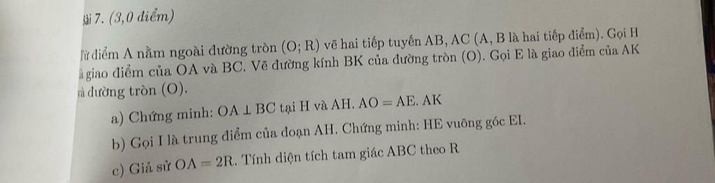 Từ điểm A nằm ngoài đường tròn (O; R) vẽ hai tiếp tuyến AB, AC (A, B là hai tiếp điểm). Gọi H