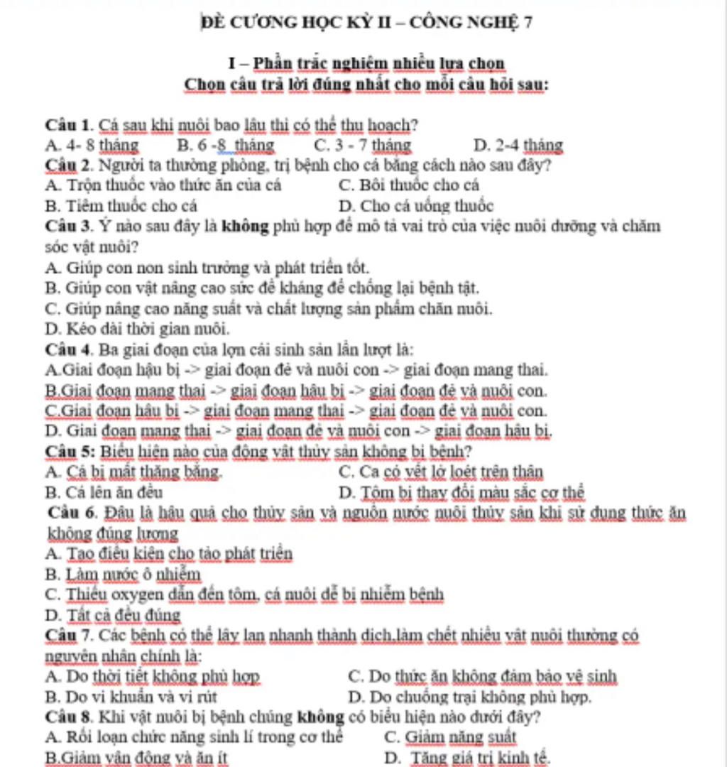 ĐỀ CƯƠNG HỌC KỲ II – CÔNG NGHỆ 7