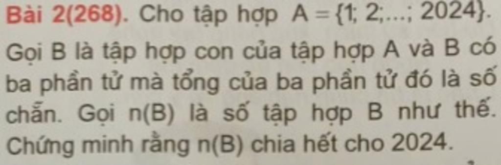 → n(B)=`1012`*`337`*`2023` nhưng không chia hết cho `2024`