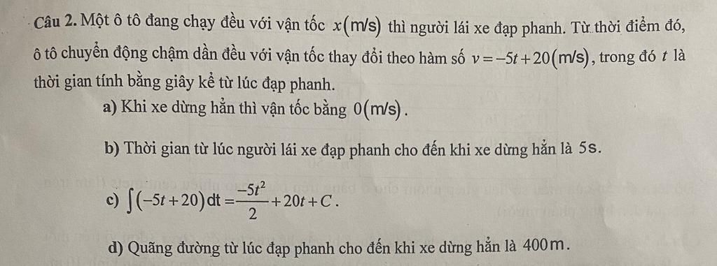 `a)` Khi xe dừng hẳn nghĩa là không còn di chuyển nữa `=>` tốc độ di chuyển `=0 =>` vận tốc lúc đó `=0 (m//s)` `=>` đúng