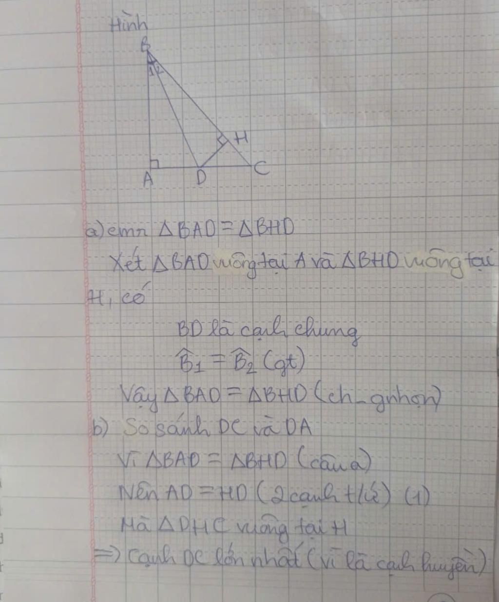 $\widehat{ABD}$ = $\widehat{HBD}$ ( BD là tia phân giác của $\widehat{ABC}$ )