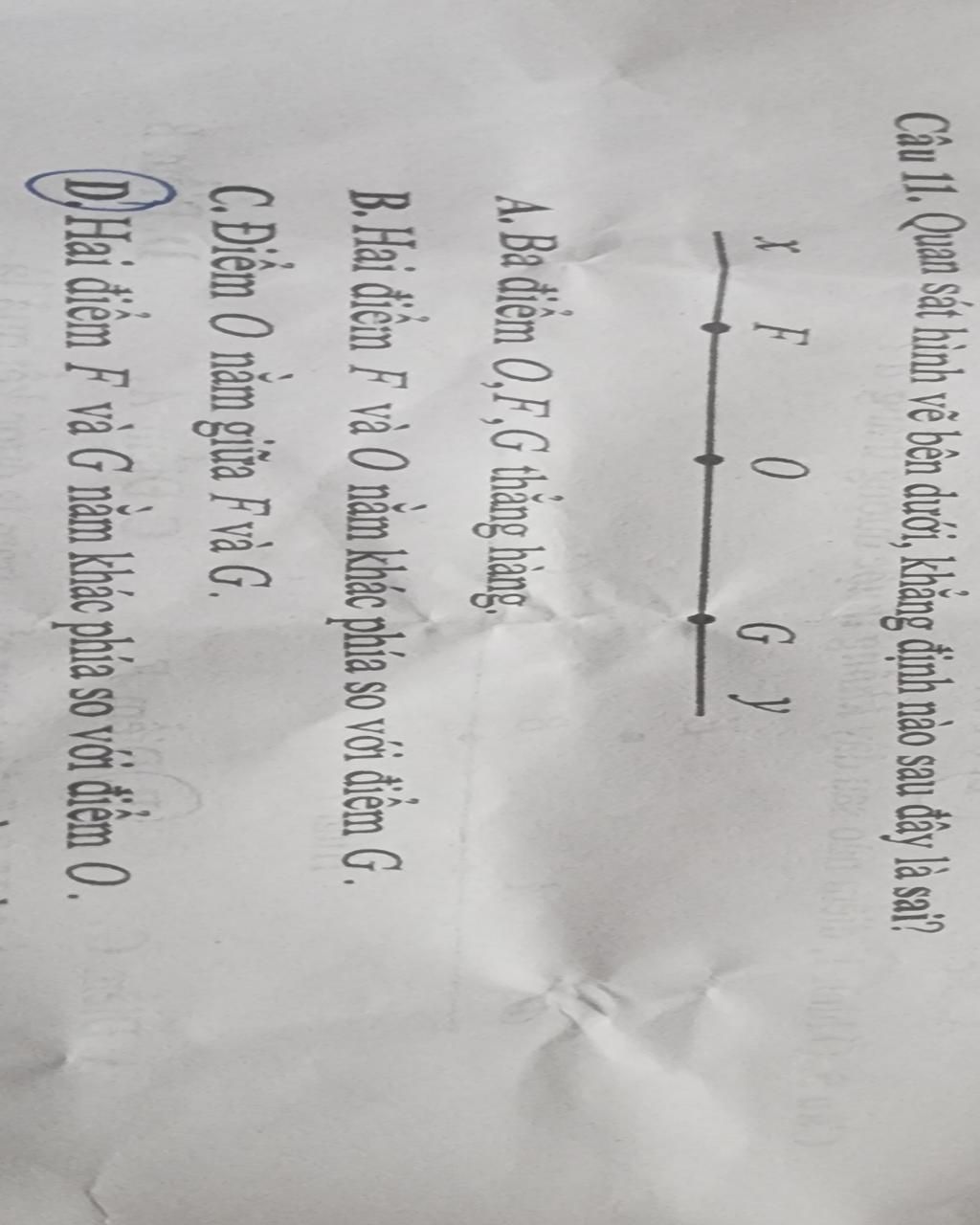 D) `2` Điểm `F` và `G` nằm khác phía so với điểm `O` là đúng Vì `F` nằm phía bên trái còn `M` nằm bên phải