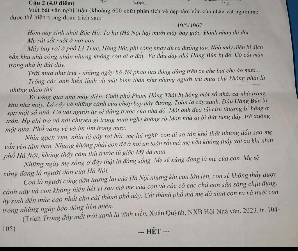 Viết bài văn nghị luận (khoảng 600 chữ) phân tích vẻ đẹp tâm hồn của nhân vật người mẹ