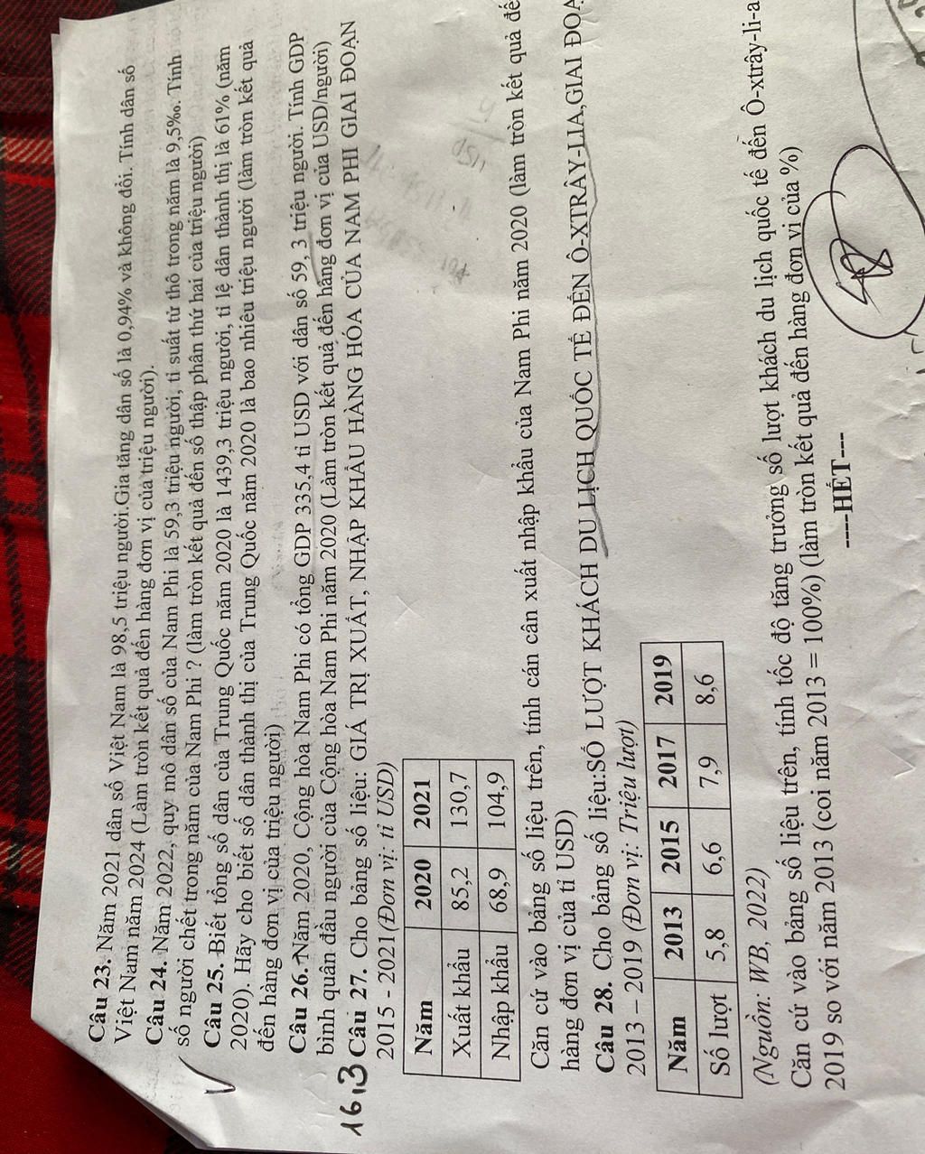 Câu `bb23`:$\\$ Dân số Việt Nam năm `2024`:$\\$ $98,5\times(1+0,94\%)^{2024-2021}=101\,($triệu người$)$$\\$ Câu `bb24`:$\\$ Số người chết trong năm của Nam Phi năm `2022`:$\\$ $\dfrac{59,3\times9,6}{100}\approx5,63\,($triệu người$)$$\\$ Câu `bb25`:$\\$ Số dân thành thị của Trung Quốc năm `2020`:$\\$ $\dfrac{1\,439,3\times61}{100}\approx878\,($triệu người$)$$\\$ Câu `bb26`:$\\$GDP bình quân đầu người của Cộng hoà Nam Phi năm `2020`:$\\$ $\dfrac{335,4\times10^3}{59,3}\approx5\,656\,\rm(USD/người)$$\\$ Câu `bb27`:$\\$ Cán cân xuất nhập khẩu của Nam Phi năm `2020`:$\\$ $85,2-68,9\approx16($tỉ USD$)$$\\$ Câu `bb28`:$\\$ Tốc độ tăng trưởng số lượt khách du lịch quốc tế đến Ô$-\:$xtrây$-\:$li$-\:$a `2019` so với năm`2013`:$\\$ $\dfrac{8,6}{5,8}\times100\approx148(\%)$