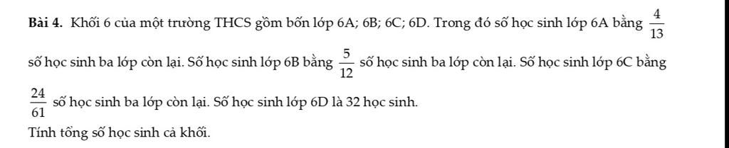 Số học sinh lớp 6A bằng `4/13` số học sinh `3` lớp còn lại nên :