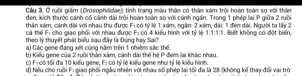 Câu 3. Ở ruồi giấm (Drosophilidae), tính trạng màu thân có thân xám trội hoàn toàn so với thân