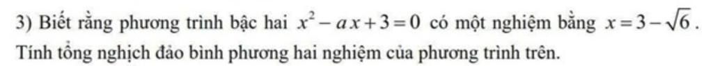 Vì phương trình bậc hai $x^{2}$ - `ax` + `3` = `0` có một nghiệm là `x` = `3` `-` $\sqrt{6}$ nên thay `x` = `3` `-` $\sqrt{6}$ vào phương trình $x^{2}$ - `ax` + `3` = `0`, ta được: