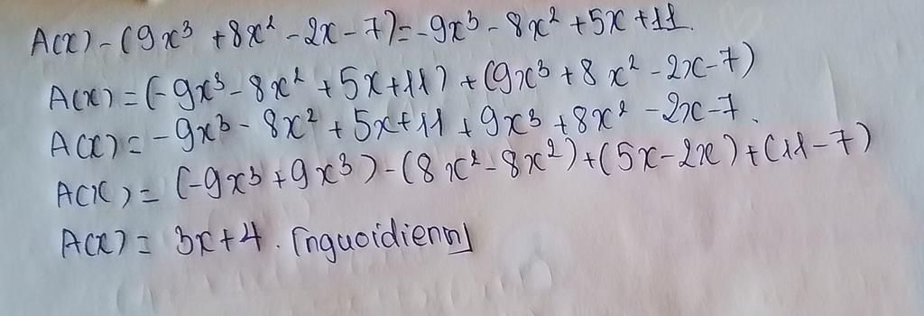 Cho biết `A(x) – (9x3 + 8x2 – 2x – 7) = –9x3 – 8x2 + 5x + 11.`