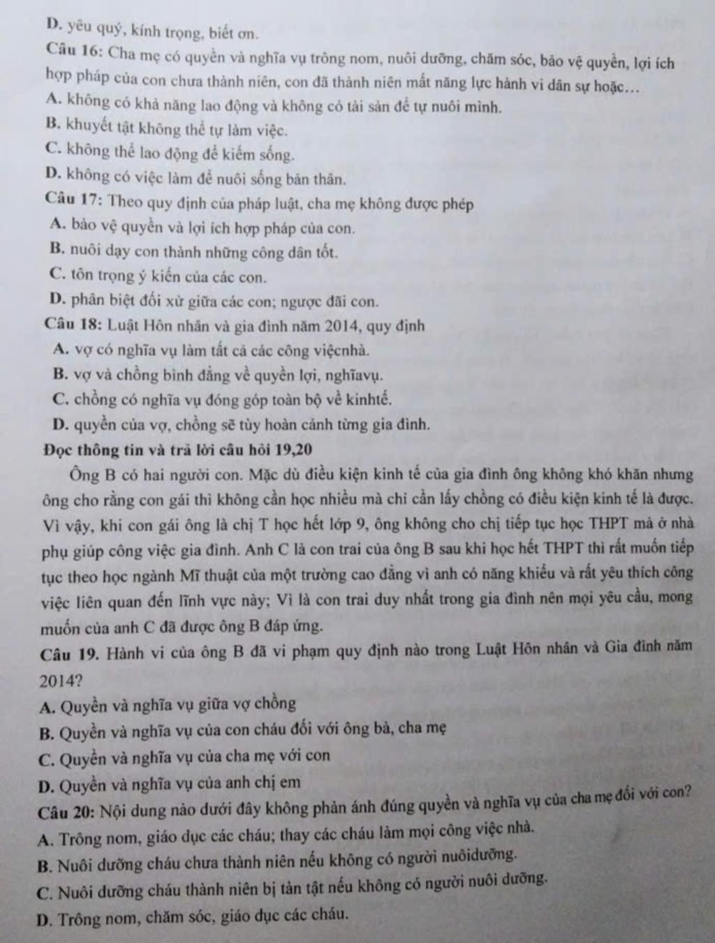 `Câu 19: C.` quyền và nghĩa vụ của cha mẹ với con`.`