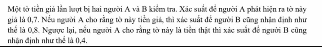 TH3: Người `A` và `B` đều xác nhận đây là tờ tiền giả: `P(B|A) = 0,7. 0,8 = 0,56`