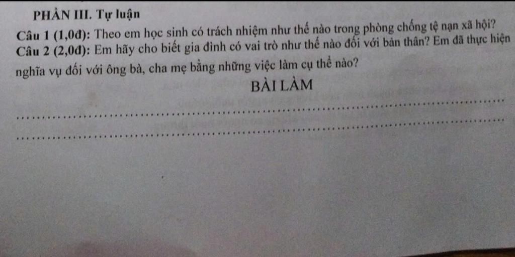 Câu 1: Theo em,học sinh nên có trách nhiệm trong phòng chống tệ nạn xã hội một cách nghiêm túc và chặt chẽ hơn nữa,học sinh nên nhận thức được mức độ nguy hiểm của tệ nạn xã hội, cần có hành vi lên tiếng báo ngay lại với chính quyền địa phương hoặc thầy cô giáo,người lớn khi phát hiện hành vi liên quan đến tệ nạn xã hội