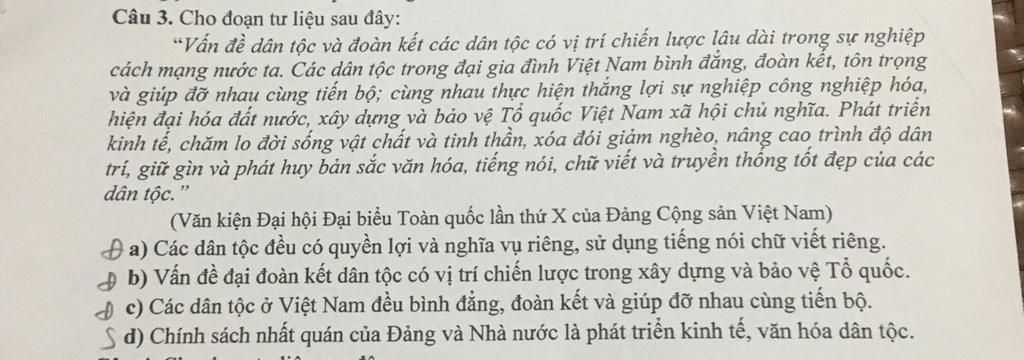 Câu 3 : a) Sai ( Vì đoạn tư liệu không nói đến quyền lợi và nghĩa vụ riêng