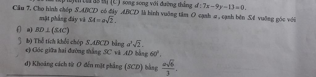 Câu 7. Cho hình chóp S.ABCD có đáy ABCD là hình vuông tâm O cạnh a, cạnh bên SA vuông góc với