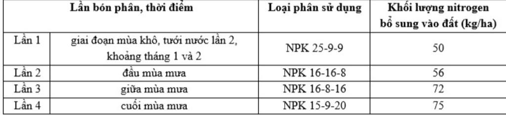 Phân bón NPK là hỗn hợp muối ammonium nitrate, Ammonium hydrogen phosphate, potassium chloride và một lượng phụ gia không chứa nguyên tố dinh dưỡng. Giả thiết vườn cà phê trồng 5000 cây/ha, ở giai đoạn kinh doanh người ta bón phân NPK cho vườn cà phê 4 lần/năm được thông báo trong bảng sau: