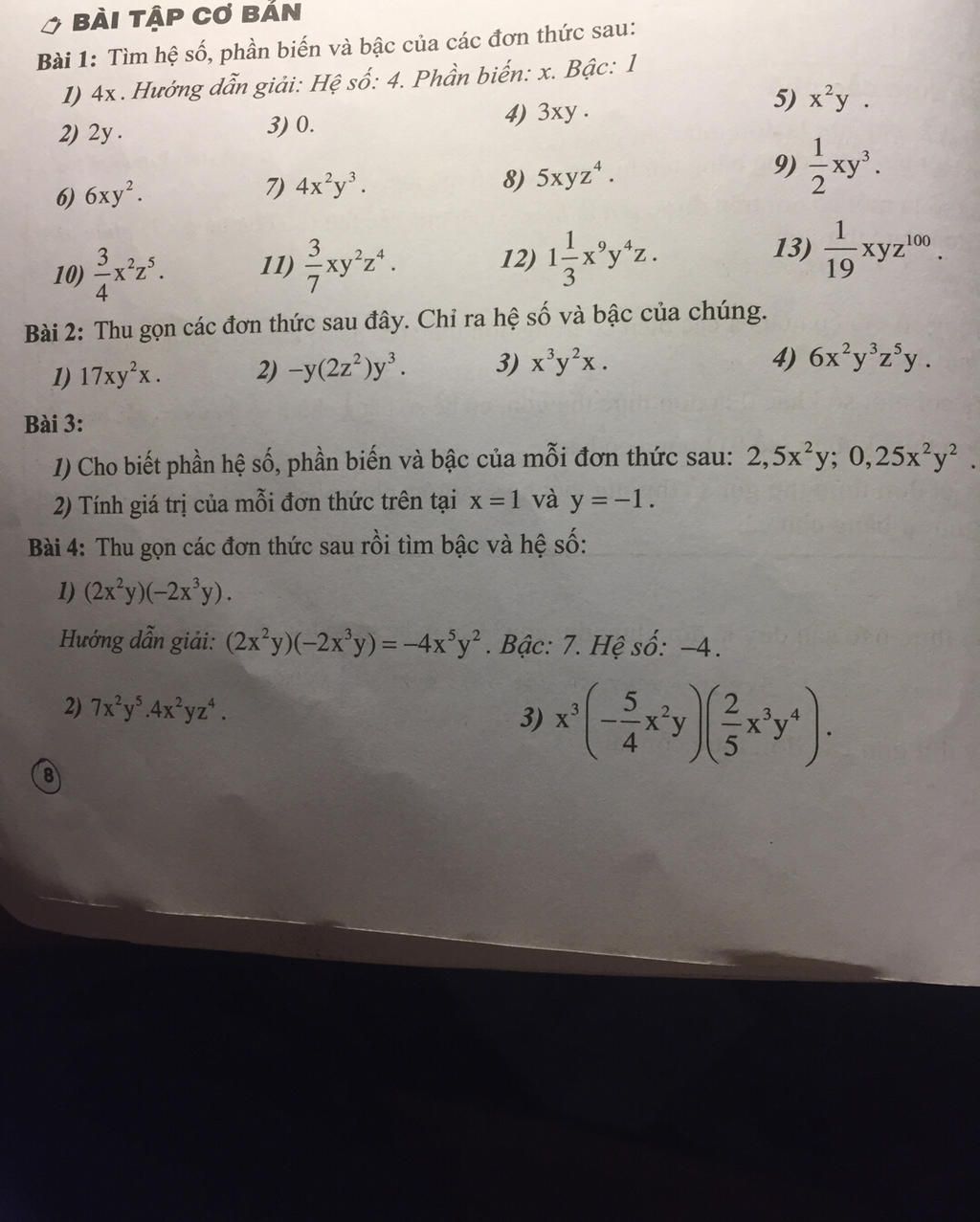 `1)` Hệ số của đơn thức `2,5 x^2 y` là: `2,5`