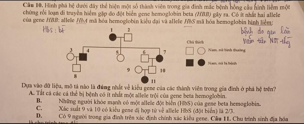 `C.`Người số 9 và 10 có thể là HbA/HbA hoặc HbA/HbS, nhưng xác suất mang allele đột biến HbS là 2/3.