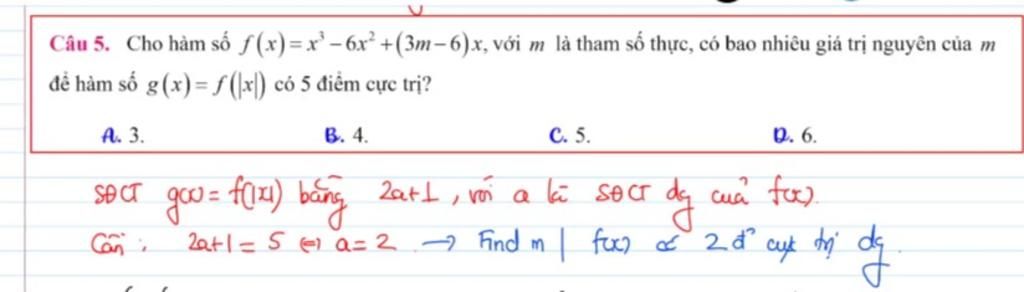 Câu 5. Cho hàm số f(x)=x-6x +(3m−6)x, với m là tham số thực, có bao nhiêu giá trị nguyên của m