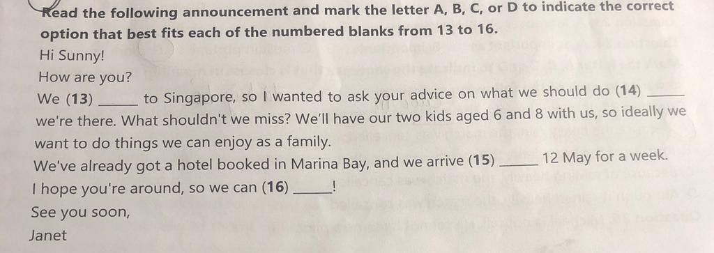 Câu 16: B | “meet up” = “gặp nhau” (dùng khi lên kế hoạch gặp bạn bè).