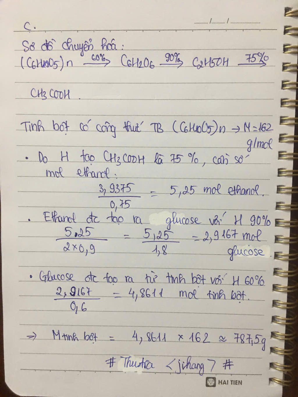 Tính khối lượng tinh bột cần dùng để điều chế lượng acetic acid ở trên nếu hiệu suất các quá trình trên lần lượt là 60%, 90%, 75%.