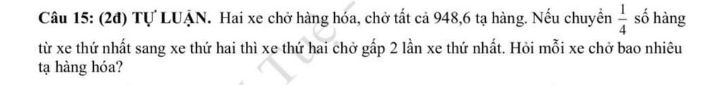 Sau khi chuyển sang xe thứ `2` thì xe thứ `1` còn lại số phần llà: