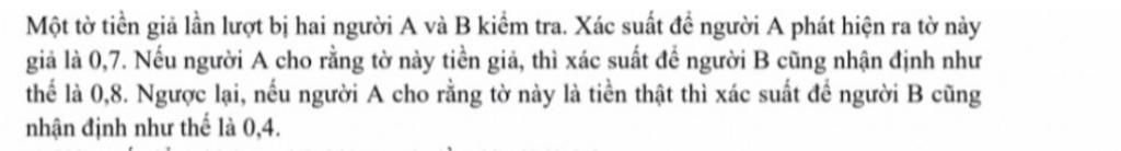 Gọi `A` là biến cố " Người A cho rằng tờ tiền là giả "