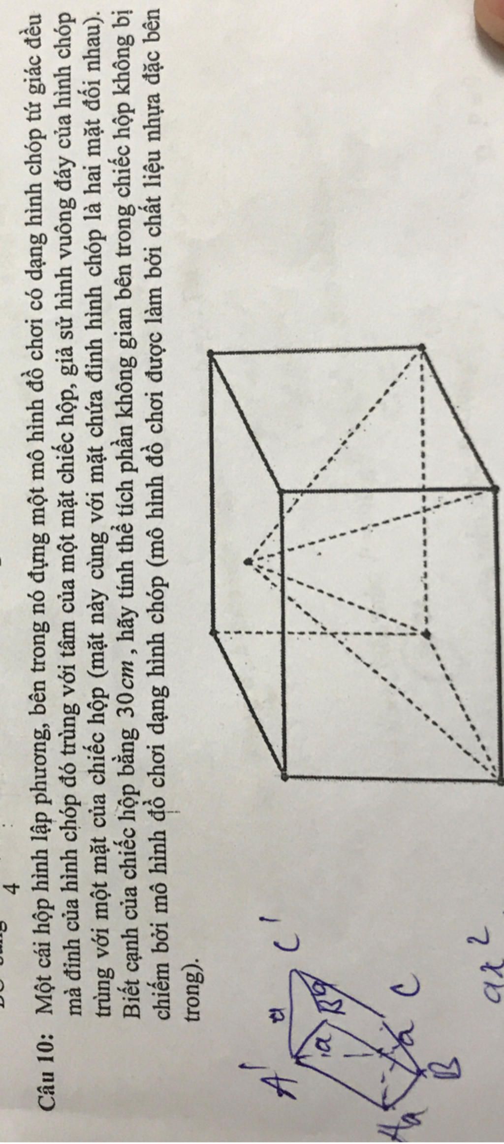 Diện tích đáy của hình lập phương và hình chóp tứ giác đều là : `30.30 = 900cm^2`