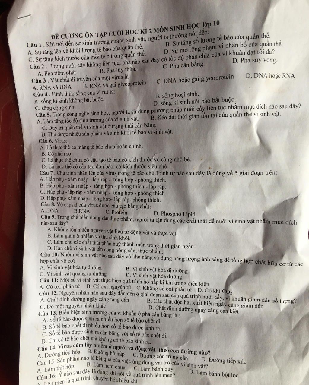 ĐỀ CƯƠNG ÔN TẬP CUỐI HỌC KÌ 2 MÔN SINH HỌC lớp 10