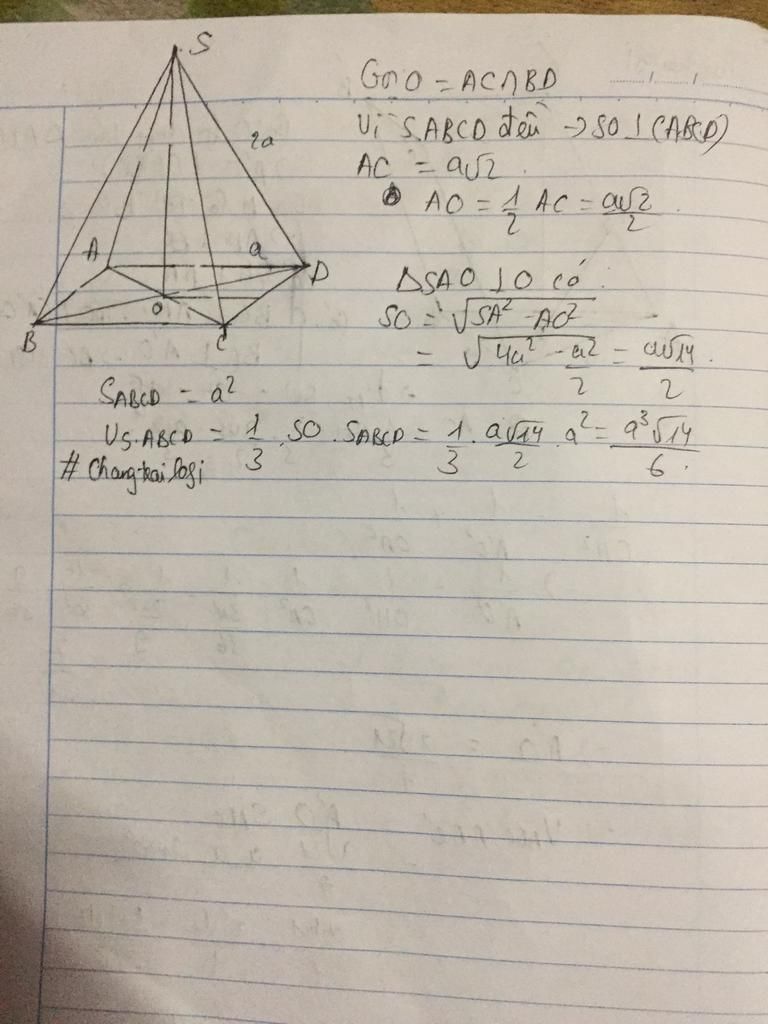 Câu 1: Cho hình chóp đều S.ABCD có cạnh đáy là a, cạnh bên bằng 2a. Tính thể tích của khối S.ABCD.