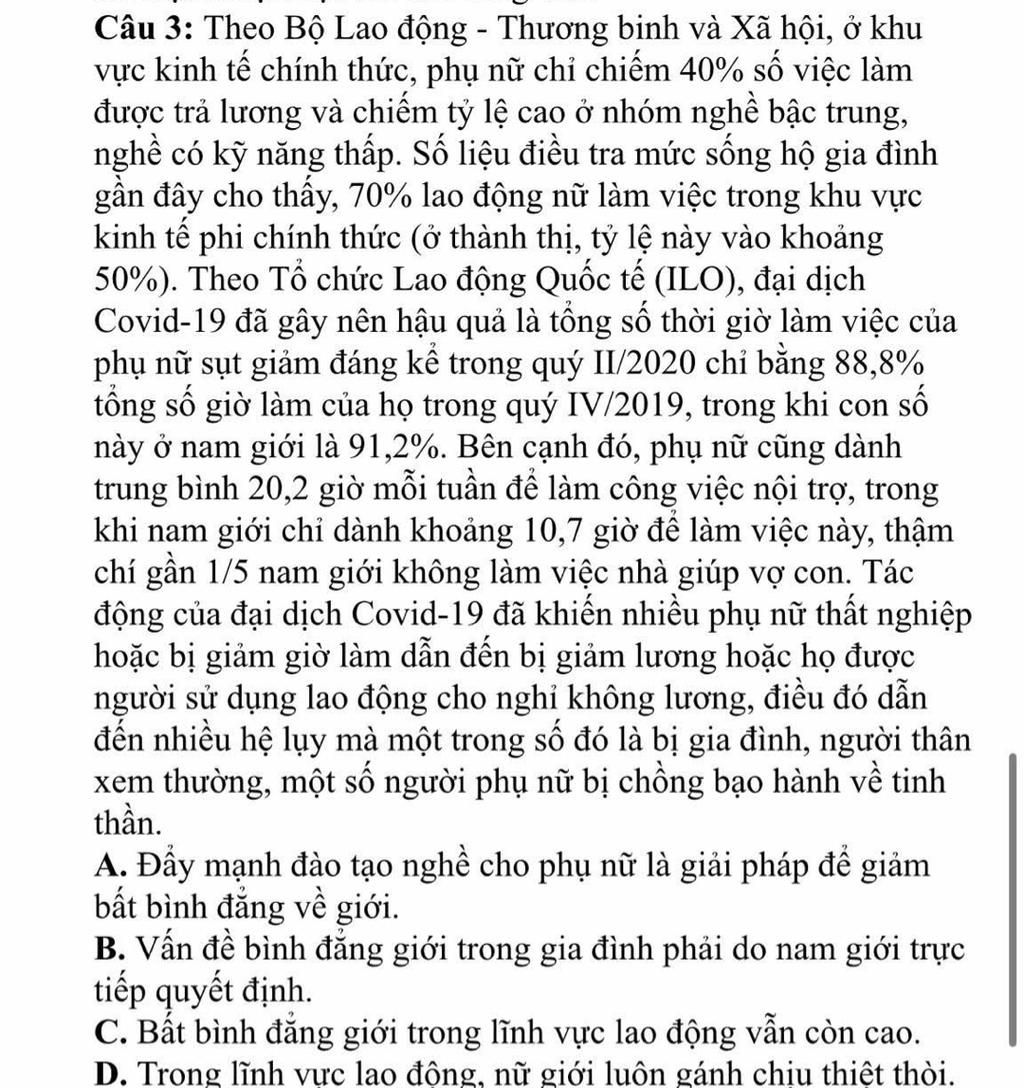 Đáp án đúng là: `C`. Bất bình đẳng giới trong lĩnh vực lao động vẫn còn cao.