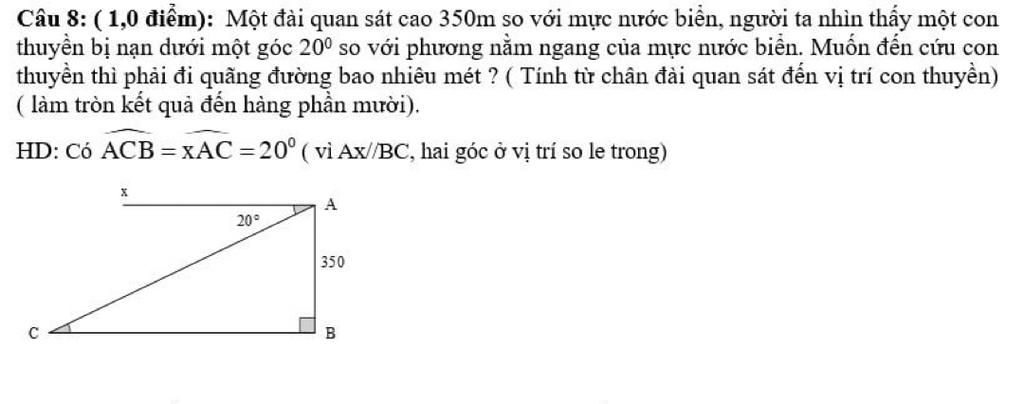 Gọi `C` là điểm con thuyền gặp nạn; `B` là chân tháp; `A` là vị trí quan sát được; `BC` là đoạn đường cần đi để cứu con thuyền.