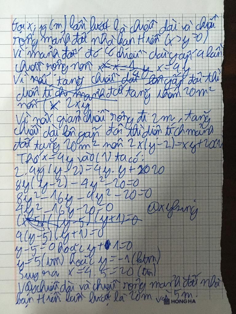 giải bài toán bằng cách lập hệ phương trình.Nhà bạn Minh Hiền được ông bà Nội cho một mảnh đất hình chữ nhật. Khi bạn Nam đến nhà bạn Hiền chơi, Hiền đố Nam tìm ra kích thước của mảnh đất khi cho biết: mảnh đất đó có chiều dài gấp bốn lần chiều rộng và nếu giảm chiều rộng đi 2m, tăng chiều dài lên gấp đôi thì diện tích mảnh đất đó sẽ tăng thêm 20m2. Các em hãy giúp Nam tìm ra chiều dài và chiều rộng của mảnh đất nhà bạn Hiền