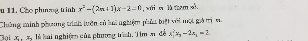 Ta xét: `\Delta=b^{2}-4ac=[-(2m+1)]^{2}-4.1.(-2)=(2m+1)^{2}+8>0AAm\inRR`