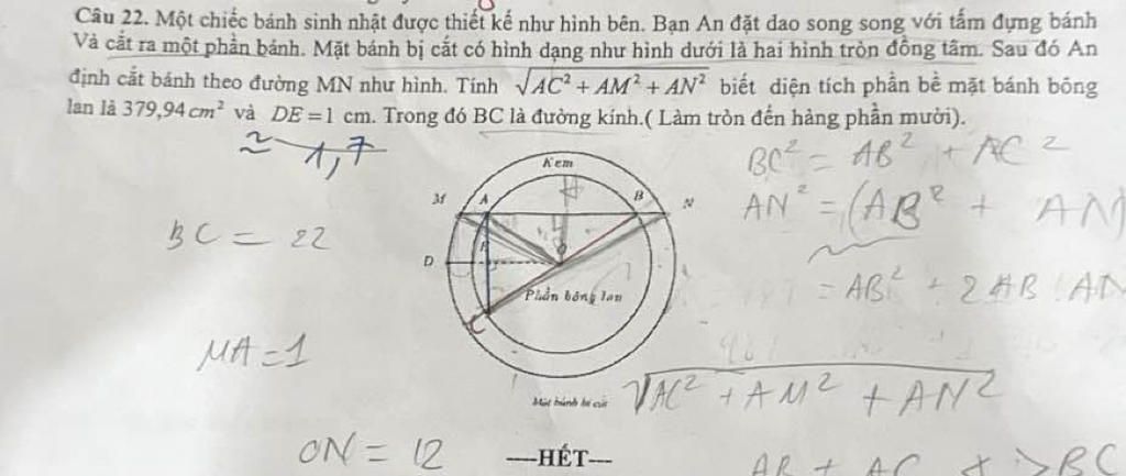 - Diện tích hình tròn lớn là $$S_{1} = \pi R^{2}$$S1=πR2. Diện tích hình tròn nhỏ là $$S_{2} = \pi r^{2}$$S2=πr2. Diện tích phần bông lan là $$S_{1} - S_{2} = 379,94 cm^{2}$$S1−S2=379,94cm2