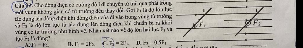 Từ hình vẽ ta thấy mật độ đường sức từ tăng lên gấp đôi sau khi từ vùng có từ trường $B_1$ đến vùng có từ trường $B_2.$