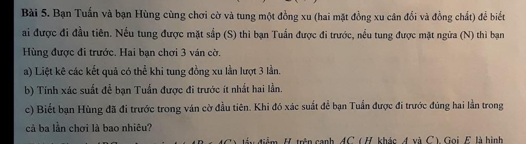 Vì nếu ra mặt sấp thì bạn Tuấn được đi trước nên ta có `4` biến cố thuận lợi cho biến cố "bạn Tuấn được đi trước ít nhất `2` lần" : `S``SN,SNS,NS``S,S``SS`