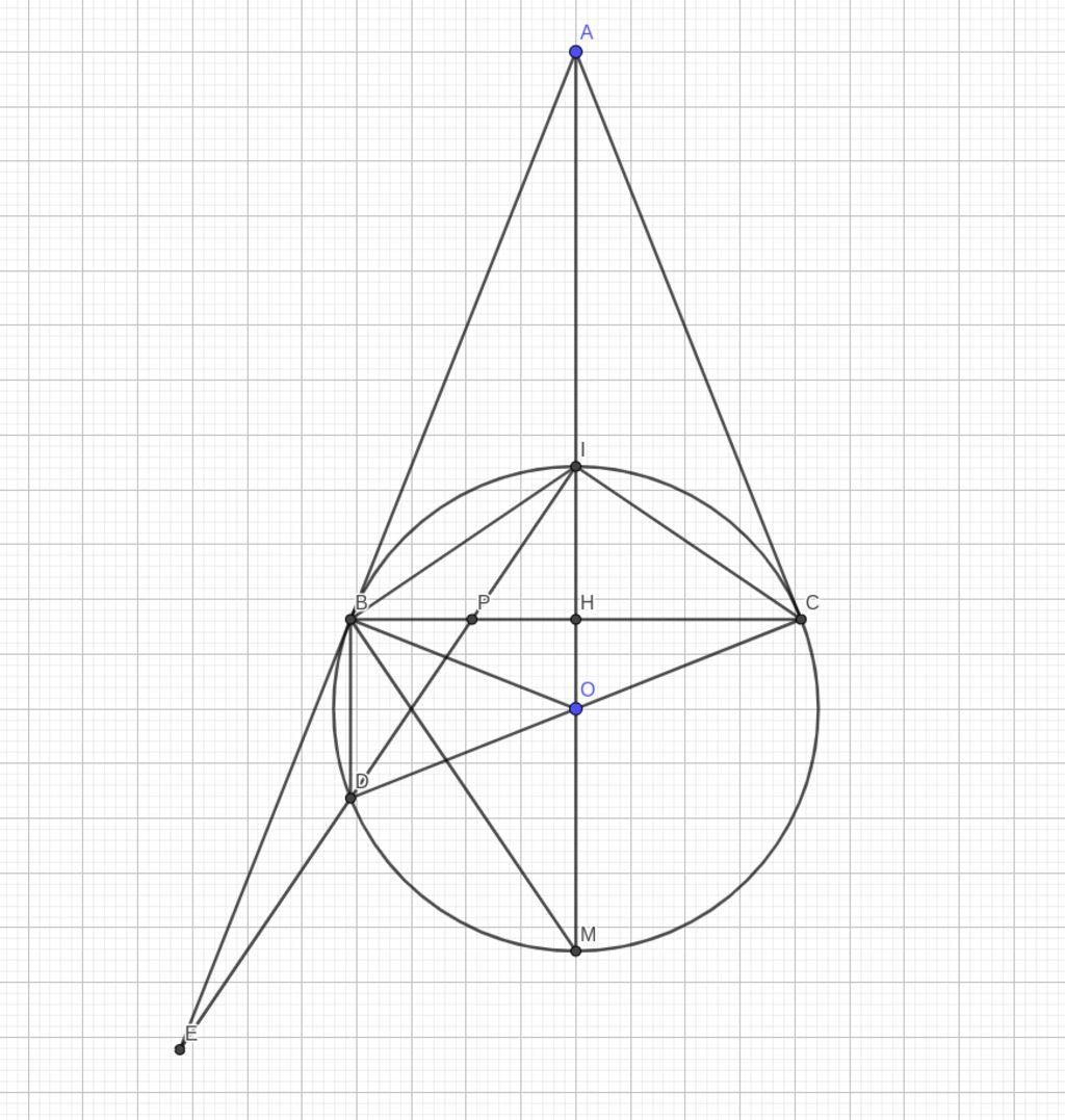 b) Gọi I và M lần lượt là giao điểm của tia AO và (O) (AI < AM).Kẻ đường kính CD của (O) gọi P và E lần lượt là giao điểm của ID với BC và AB.Chứng minh tam giác ABM đồng dạng tam giác IBD
