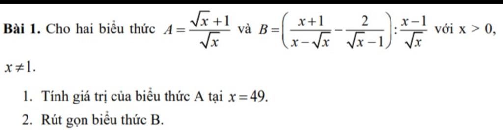 `2, B = ((x + 1)/(x - sqrt(x)) - 2/(sqrt(x) - 1)) : (x - 1)/(sqrt(x)) (x > 0 , x` $\neq$ `1)`