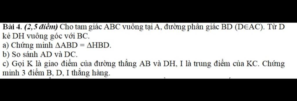 Bài 4. (2,5 điểm) Cho tam giác ABC vuông tại A, đường phân giác BD (DEAC). Từ D