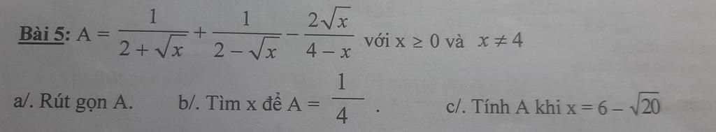 Vậy `A = (sqrt(5)-1)/2` khi `x = 6 - sqrt(20)`