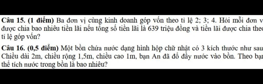 Đáp án: câu 15 : gọi x,y,z lần lượt là số vốn mà ba đơn vị kinh doanh góp ( x , y , z > 0 )