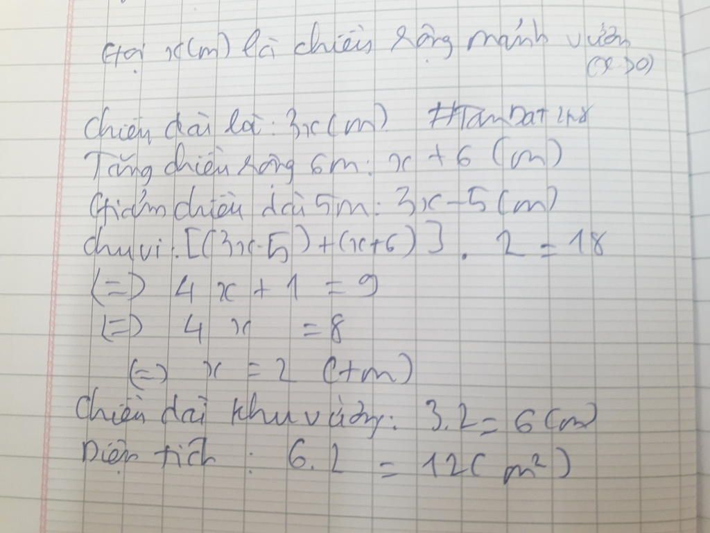 Giải bài toán bằng cách lập phương trình Một mảnh vườn hình chữ nhật có chiều dài gấp ba lần chiều rộng .Nếu tăng chiều rộng thêm 6m va giảm chiều dài đi 5m thì chu vi của mảnh vườn là 18m. Tính diện tích mảnh vườn